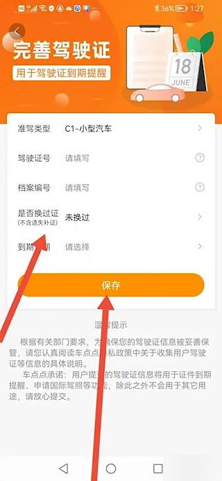 4、根据界面提示完整填写驾驶证相关信息,最后选择保存完成录入。