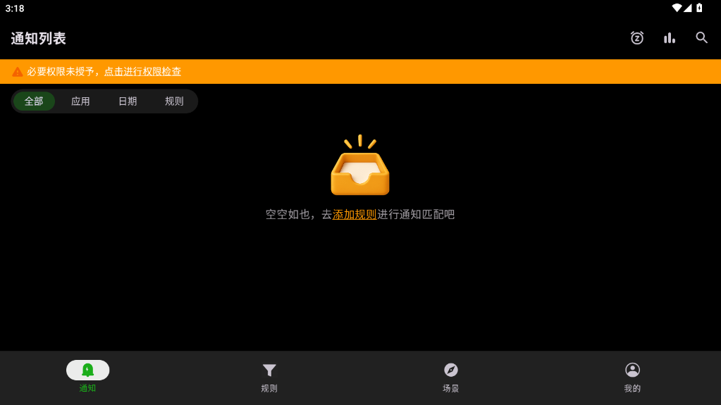 2、打开应用后,首个呈现的Tab页即为通知列表,在这里能查看所有成功匹配的通知历史,点击单个通知卡片可查看详情,详情包含通知来源、推送应用包名、命中规则及执行任务。