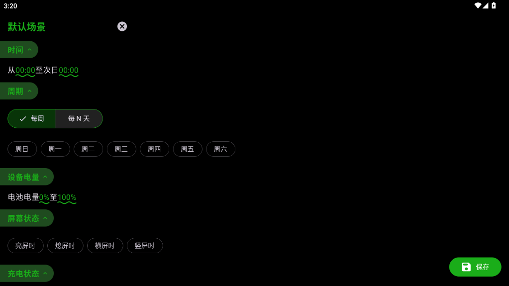 4、场景列表用于存储用户创建的各类设备场景,像当前时间段、手机是否充电、是否连家庭WIFI、是否在公司等情况都可记录,目前支持时间、星期、设备电量、屏幕状态、充电状态、网络状态、设备位置七个条件自由组合(所有条件符合场景才生效,不符合的显橙色),基本能覆盖多数生活场景,比如可通过时间段+星期+设备位置定义上班场景。