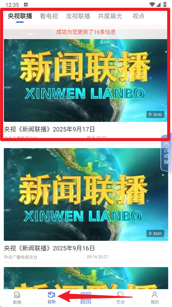 3、在底部菜单点击视听,可观看央视联播、龙江联播等视频栏目,选择封面即可播放。