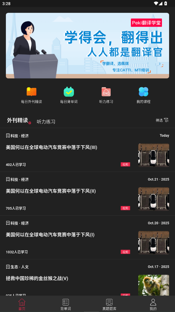 2、打开佩琪翻译官方版,进入 app 首页,熟悉首页各功能板块(如背单词、翻译、真题题库)位置;
