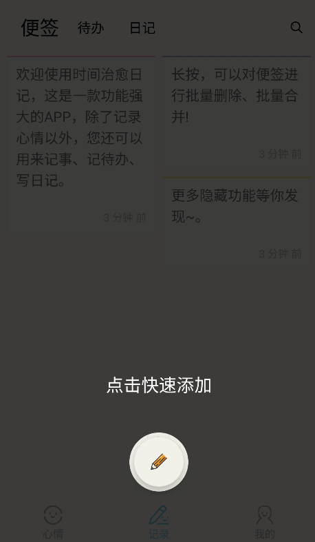 在首页点击“+”按钮,可快速新建便签、待办或日记。