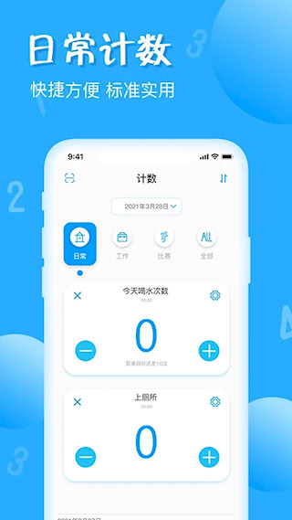 1、标准计数器提供基础计数与自定义计数项目创建功能,可设定计数目标并自动保存进度,适用于健身次数、习惯养成等场景的量化追踪。