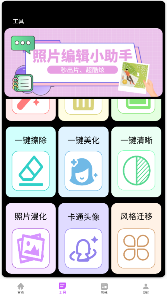 3、图片编辑功能简单便捷,导入照片后可进行消除、美化、调色、裁剪等多项操作。