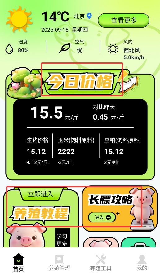 2、在首页价格板块,可查看今日猪肉、玉米饲料、豆粕行情及养殖技术教程。