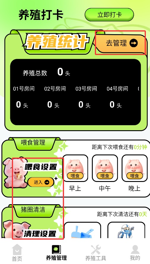 3、通过养殖管理功能,可进行养殖统计、喂食计划及清理管理等操作设置。
