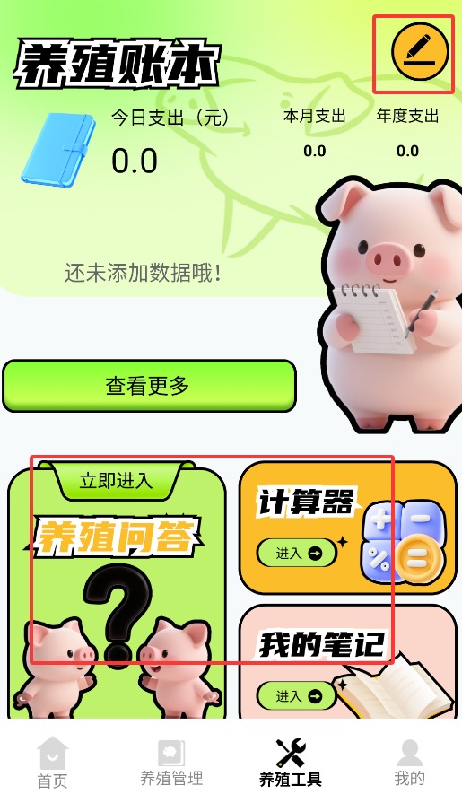 4、进入工具中心后,可记录养殖日志、使用问答工具、计算器及个人笔记功能。