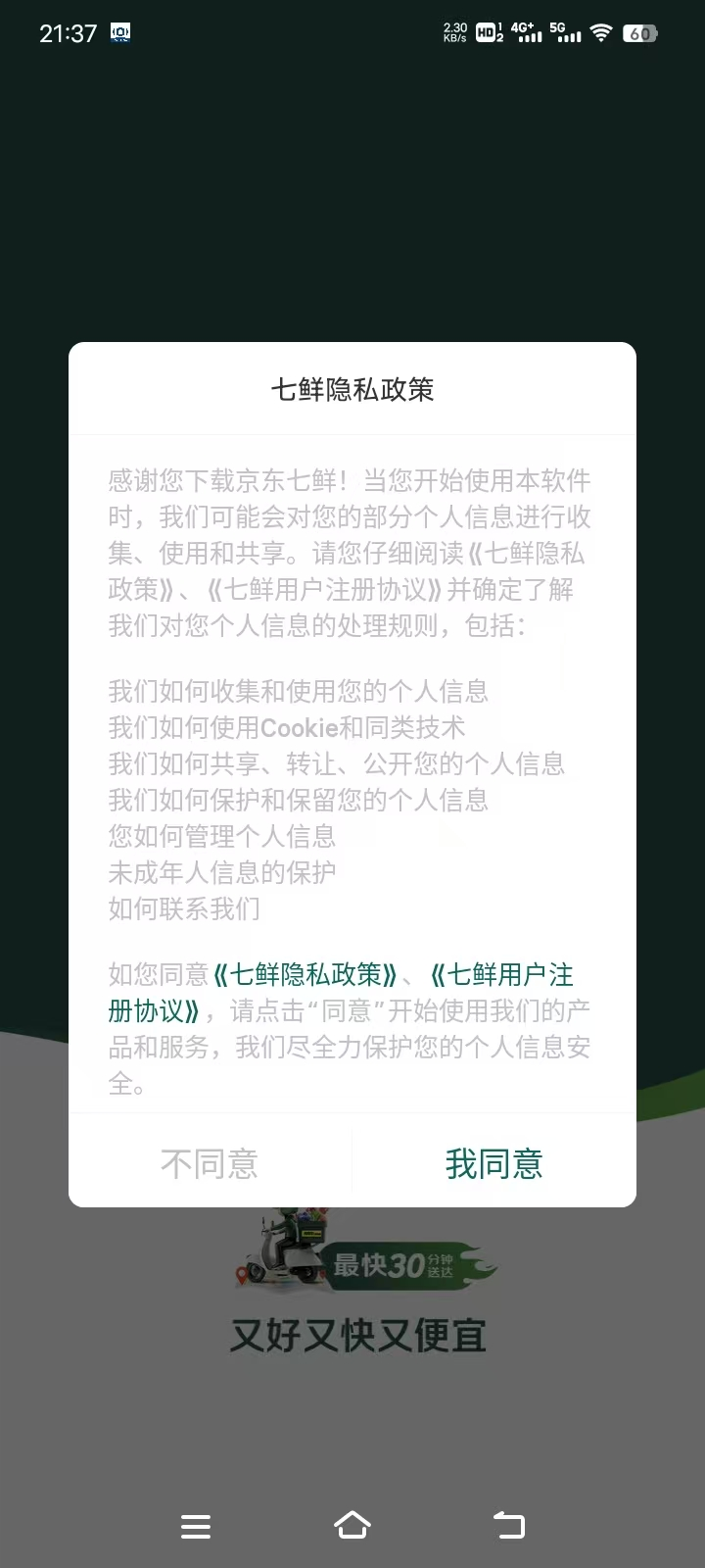 1、打开安装好的生鲜超市 APP,页面弹出协议窗口后点击 “我同意”。
