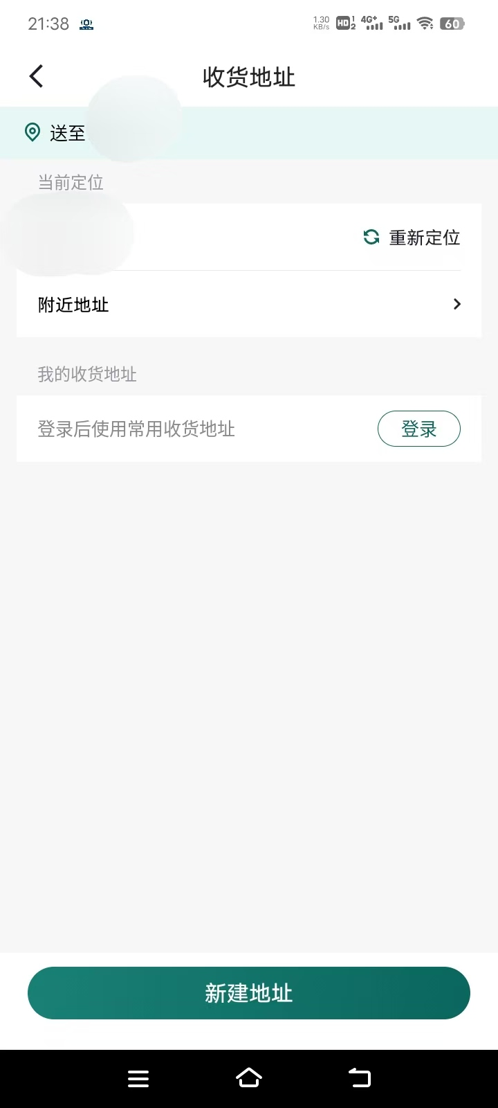 2、点击 “重新定位”,再选择 “新建地址”,按页面提示填写完整位置信息。