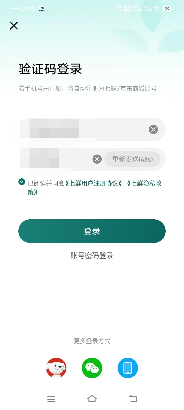 4、填入收到的验证码,点击登录即可;也可选择微信或京东账号快捷登录。