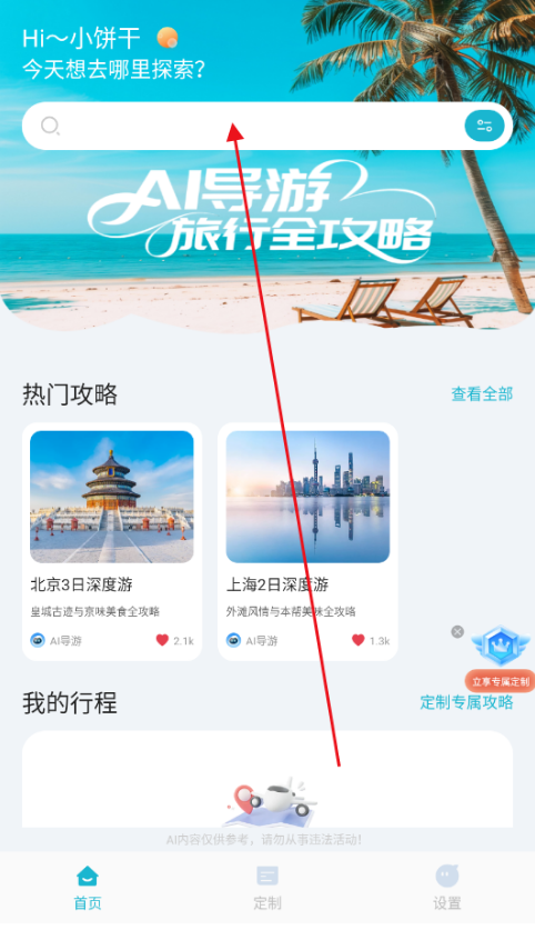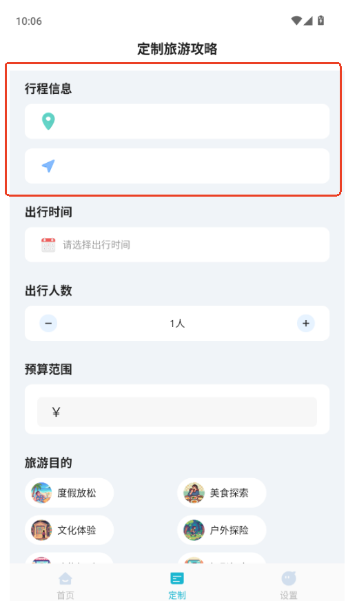 切换至【定制】页面,可根据自身需求自由设置行程安排,打造专属旅游计划。