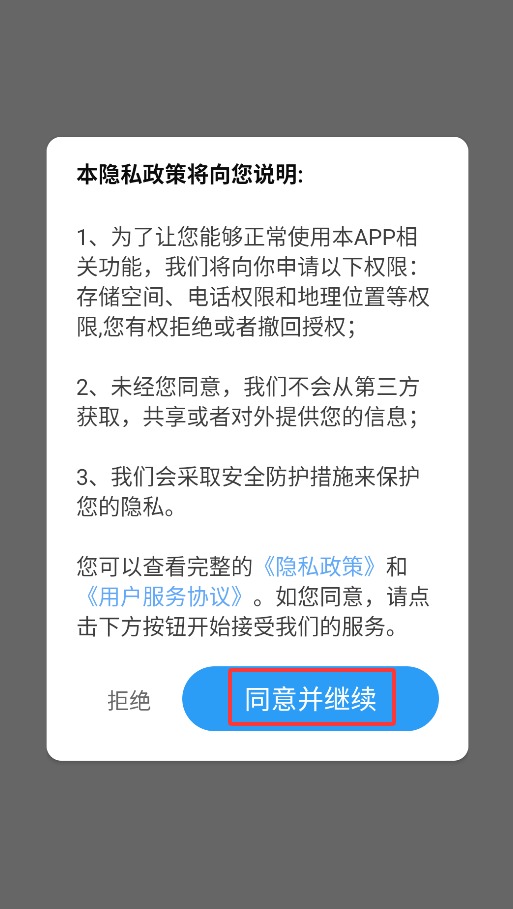 1、首次启动应用时,请点击弹窗中的同意选项,方可进入主界面开始使用。