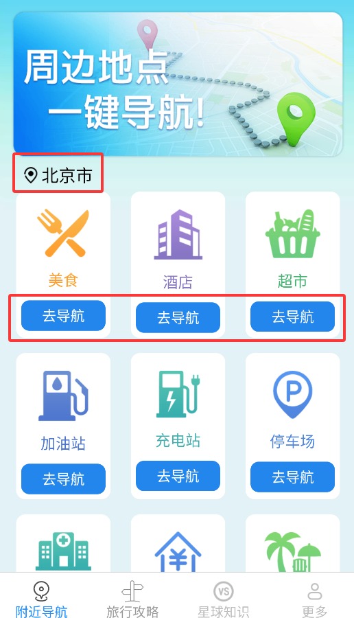 2、在附近导航板块,系统自动定位后可搜索周边美食、酒店、超市及加油站等地标。