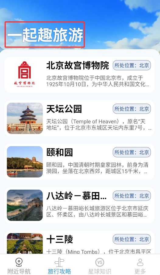 3、通过旅行攻略功能,可查看各旅游景点详细介绍与位置信息,规划行程路线。