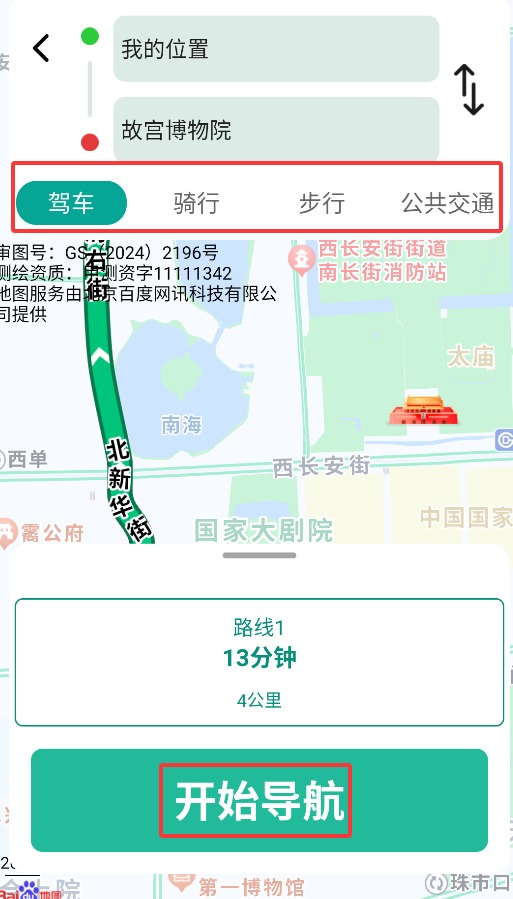 4、选择目的地后,可对比驾车、步行、骑行及公共交通路线,点击开始实时导航。
