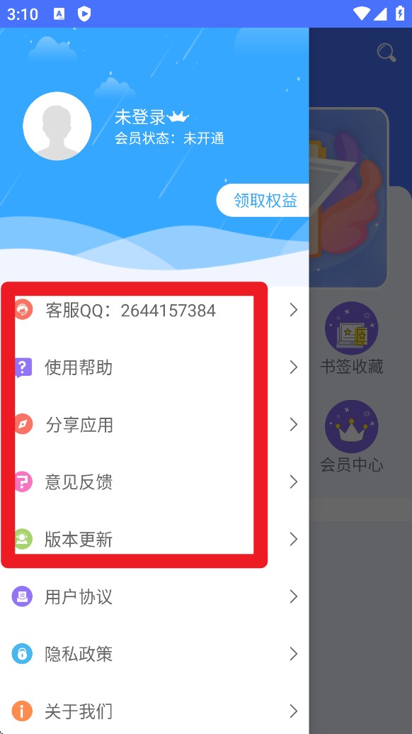 5. 点击侧边栏菜单,可以使用意见反馈、版本更新和联系客服等功能,确保使用过程中问题及时解决。
