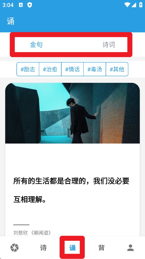 3. 切换到诵栏目,可浏览金句或诗词,选择感兴趣的分类标签,获取励志或情感表达素材。
