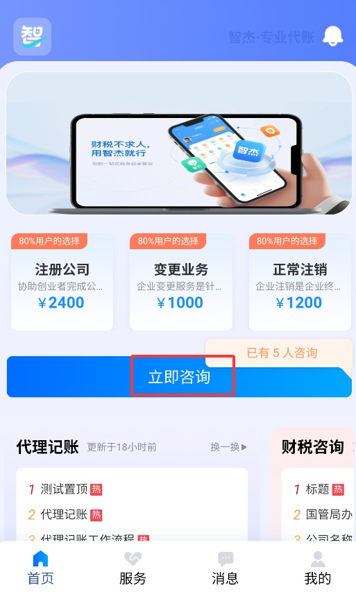 2、在首页点击立即咨询按钮,可在线查询相关服务详情与报价。