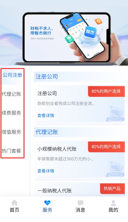 3、通过服务分类板块,可选择公司注册、代理记账、续费服务或热门套餐。