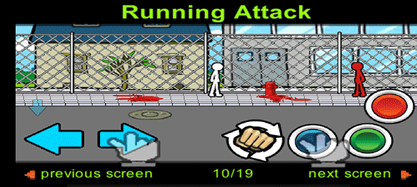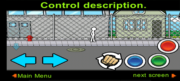 2、游戏界面左侧为方向控制按钮,用于操控火柴人移动;右侧分布转换武器、红色跳跃、蓝色攻击、绿色拳打脚踢按钮,负责战斗操作;
