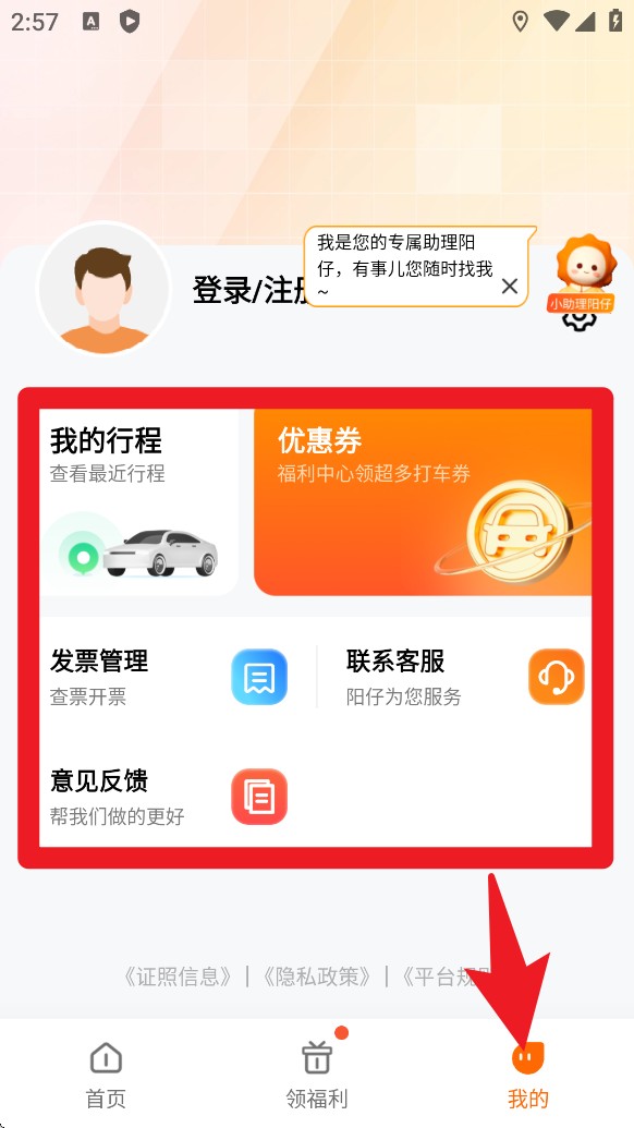3. 点击我的页面即可查看行程记录、领取优惠券或联系客户服务,方便管理个人信息。