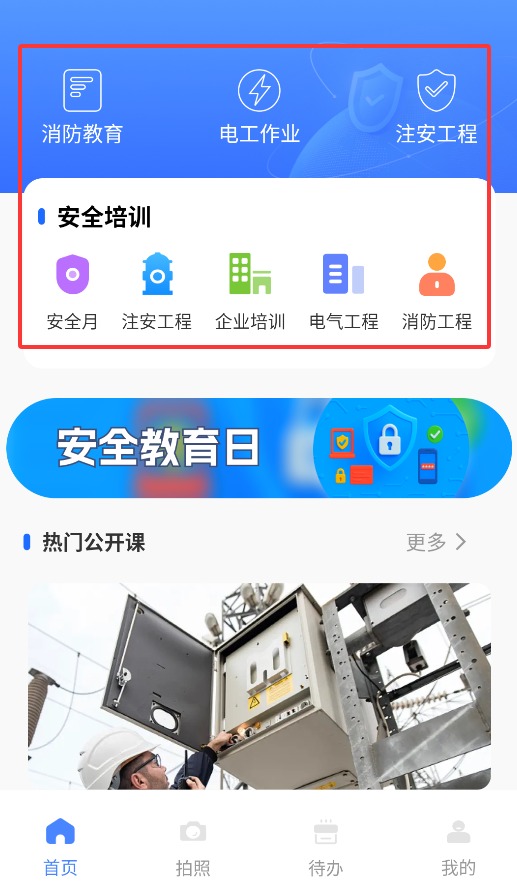 2、在首页功能区,可选择消防教育、电工作业、注安工程及安全培训等专业课程。