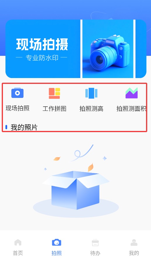 3、通过拍照工具板块,可使用现场拍照、工作拼图、测量高度及面积等实用功能。