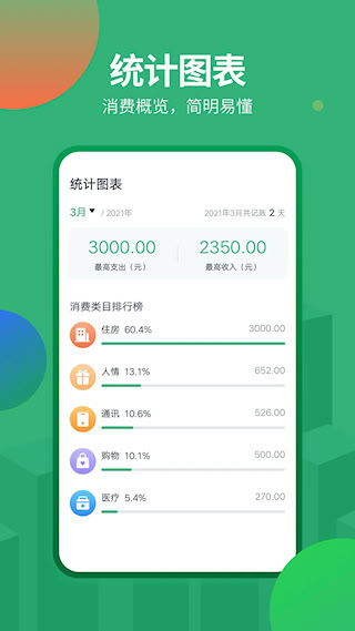 2、图表分析工具生成直观的财务概览,协助快速理解个人消费分布与趋势。