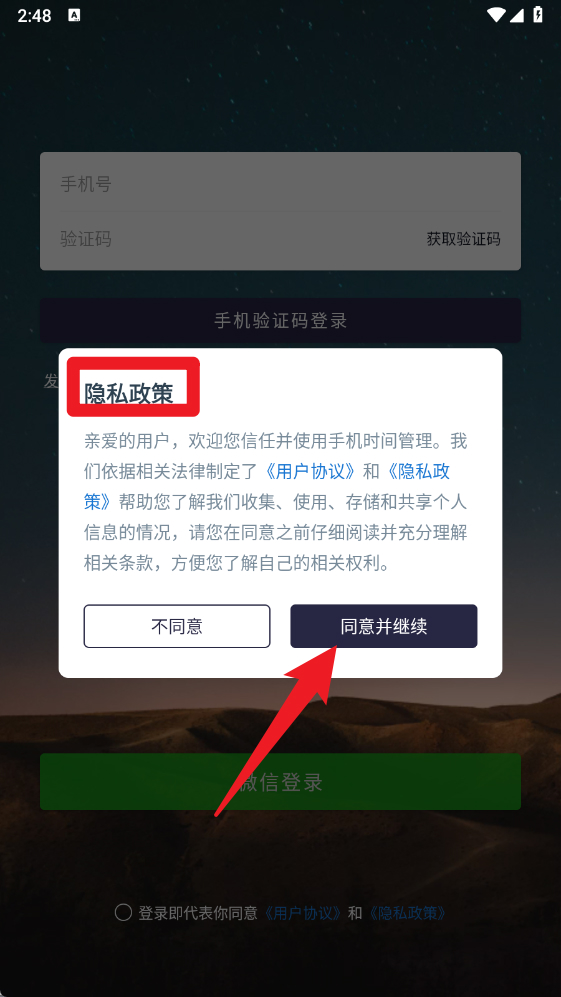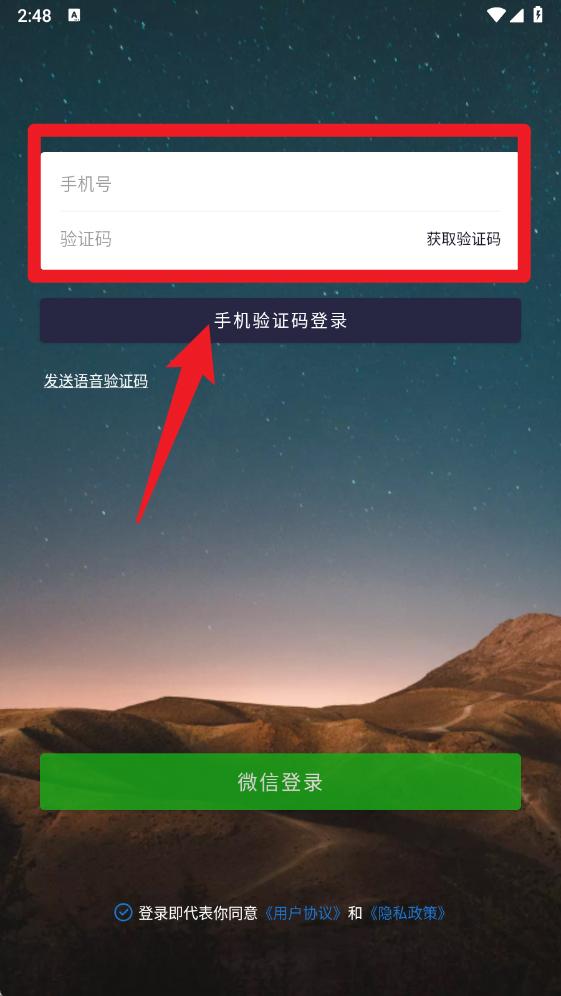 2、在登录界面输入手机号并获取验证码,选择手机验证码登录即可快速进入;也可以使用微信账号登录。