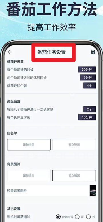 5、在番茄任务设置中,可设置每个番茄钟的时长、休息时长、数量及长休息间隔,帮助用户提升学习和工作效率。
