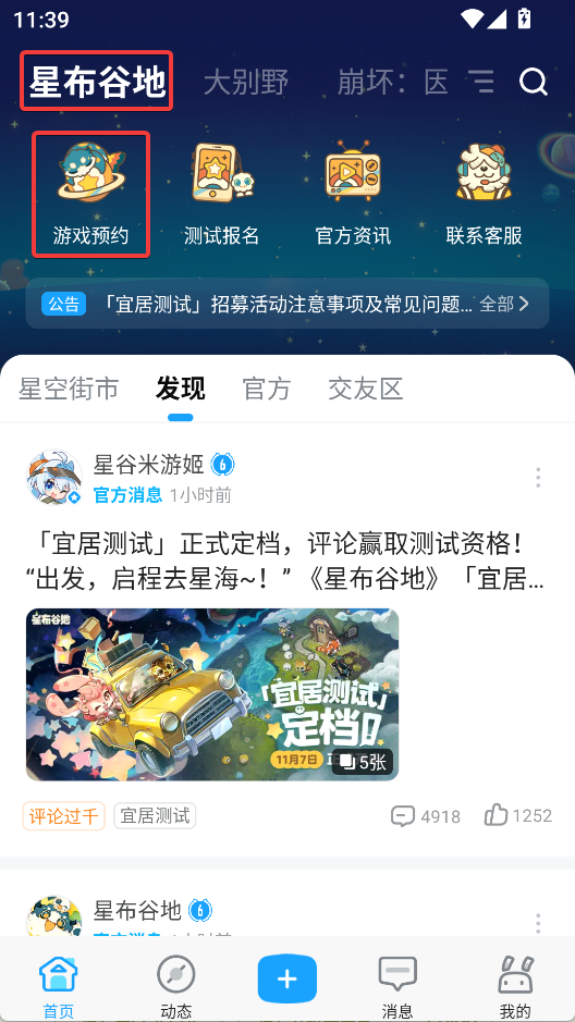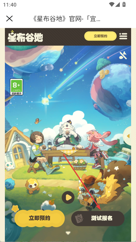 2、进入星布谷地频道,点击上方游戏预约或测试报名