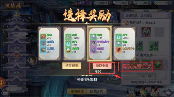 6.试炼塔,这个是获取补天丹和高级招募书的重要来源,建议玩家把灵石都花在开箱子上。