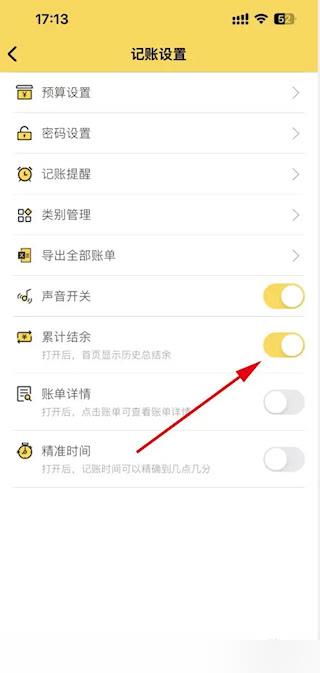 3、于设置项目列表中定位累计结余功能项,点击右侧开关按钮激活该功能。