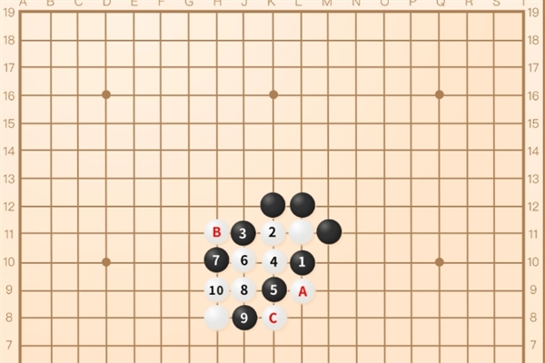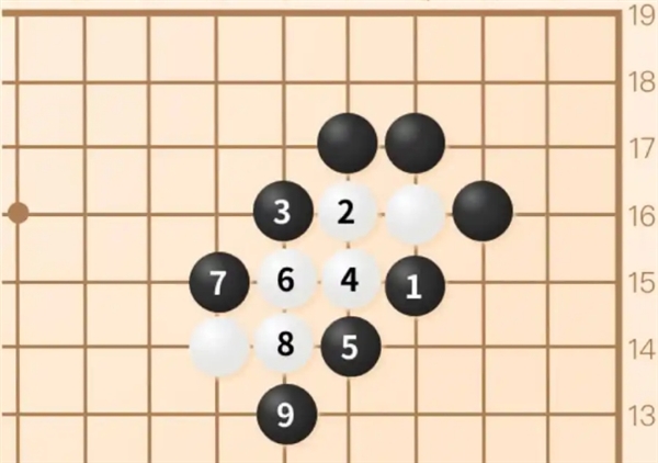 和前两个吃子方法都不同,它并没有直接堵住白棋的气,而是远远地营造一个包围圈,将对方的棋子网罗在自己的包围圈之中进行围捕的技术,是一种相对高级的吃子战术。