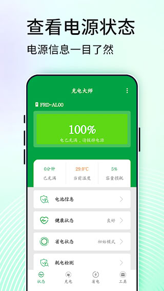 4、充电大师提供耗电分析、内存清理、充电日志、电池检测、健康度评估及散热辅助等常用维护工具。