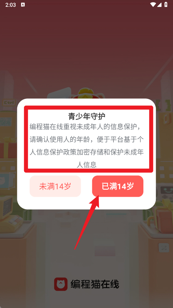 1、首次进入编程猫在线App时,会出现青少年守护提示,根据实际情况选择未满14岁或已满14岁。