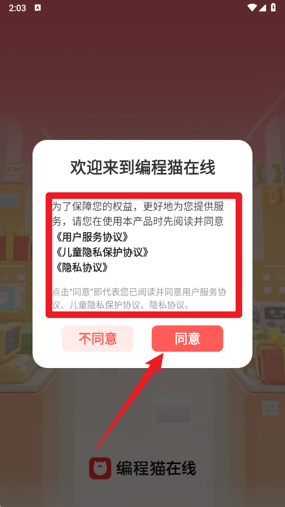 2、阅读并同意《用户服务协议》《儿童隐私保护协议》,点击同意即可继续使用。