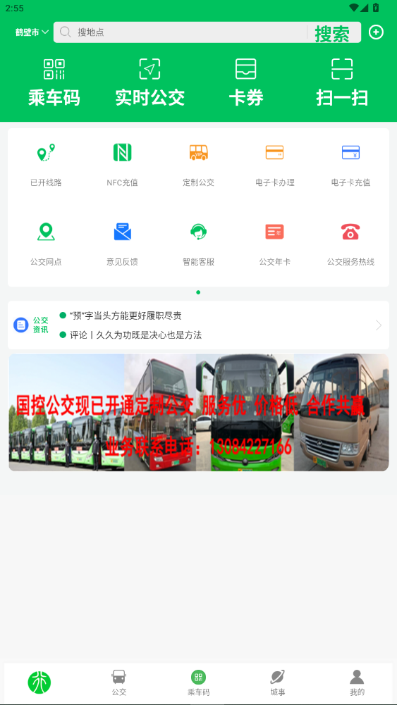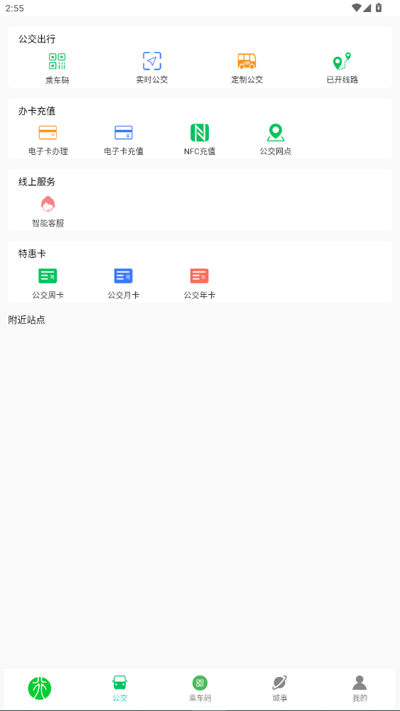 1、首页作为核心功能聚合界面,整合乘车码、实时公交、卡券、NFC 充值等核心入口,同步推送公交资讯,是获取公交服务与城市公交信息的首要平台,操作路径清晰直观;
