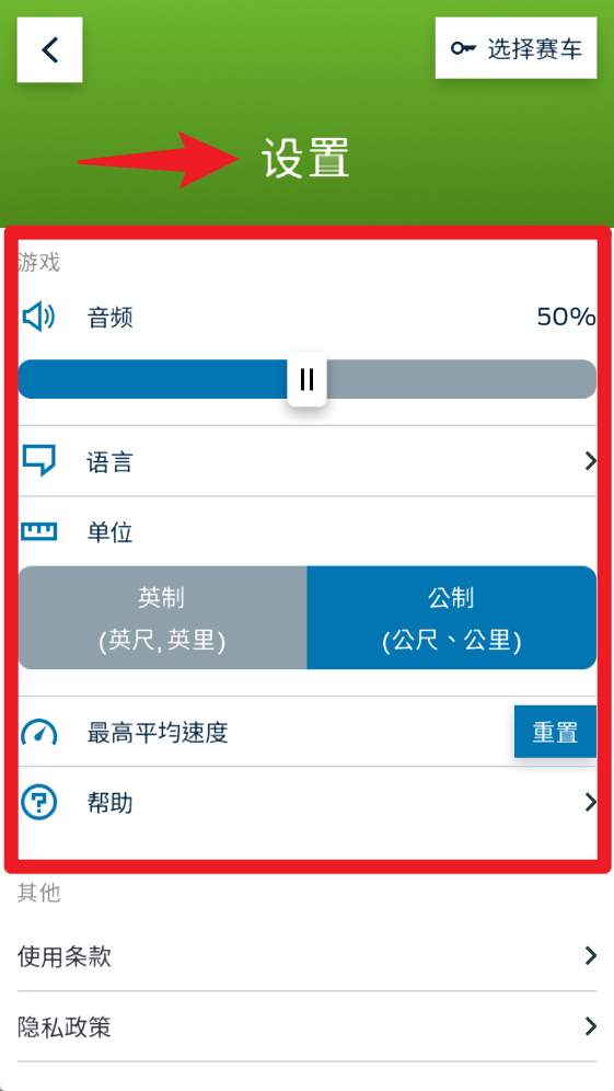 5、进入设置菜单,可调整音频音量、选择显示语言及单位,还可查看帮助和隐私政策。