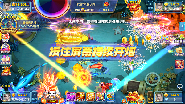 1、多人在线激战 BOSS:支持万人同时在线畅玩,更有四人同屏捕鱼玩法,邀上伙伴一同挑战强力 BOSS,尽享协作闯关的快感!