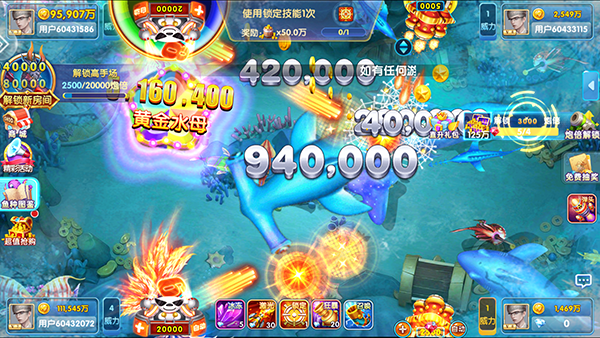 4、道具使用:游戏内提供多种道具,如冰冻、锁定、加速炮弹等,合理利用这些道具可以帮助玩家更有效地捕鱼。例如,在关键时刻使用狂暴技能、加速技能等,可以提高捕鱼效率。
