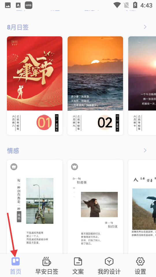 1、首页每日更新当月主题日签,例如八月重点展示建军节等节日内容。同时设有情感专栏,分享生活感悟类短文,所有内容均以图文结合的形式呈现。