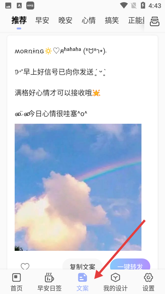 3、文案库具备推荐、早安等明确分类,内含多样化的表达内容,从活泼俏皮的问候到细腻的心情记录。支持快速复制文案或直接分享至其他平台。