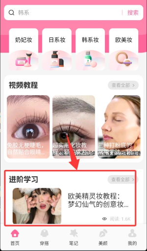 3、点击进阶学习美妆栏目,即可浏览系统化的美妆教学课程与技巧分享。