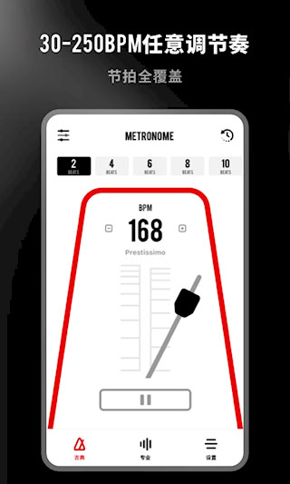 1、节拍精准稳定,由专业音乐人士参与开发校准。确保每个节拍间隔均匀,速度恒定,满足乐器练习对节奏准确性的高要求。