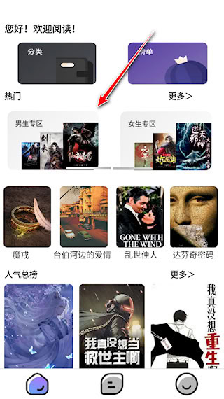 1、启动阅读工具后,主界面显示多个内容分区,例如可选择男性向作品专区进入浏览。