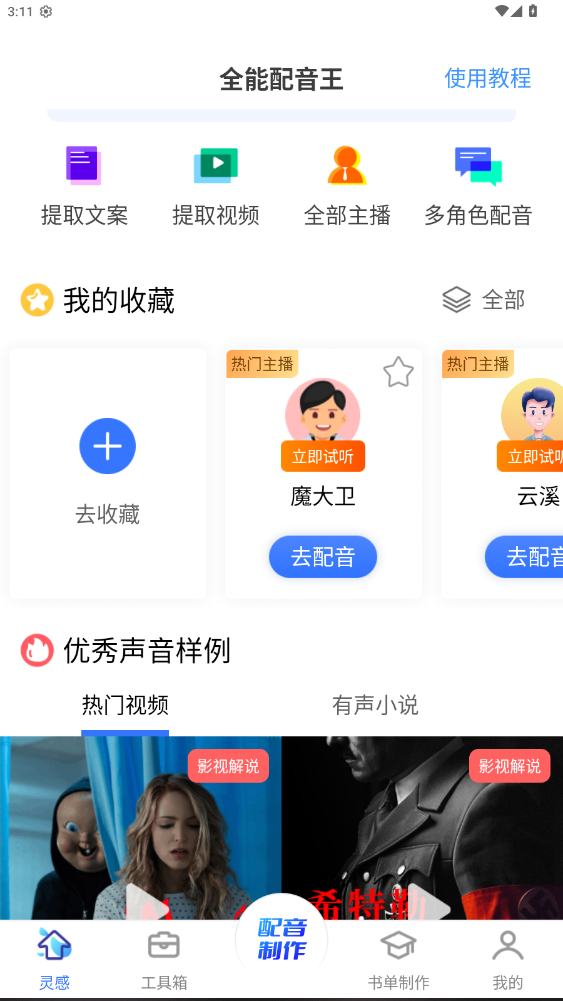 3、海量辅助工具:除核心配音功能外,还包含视频提取、文案提取、封面制作等多种工具,一站式满足创作需求。