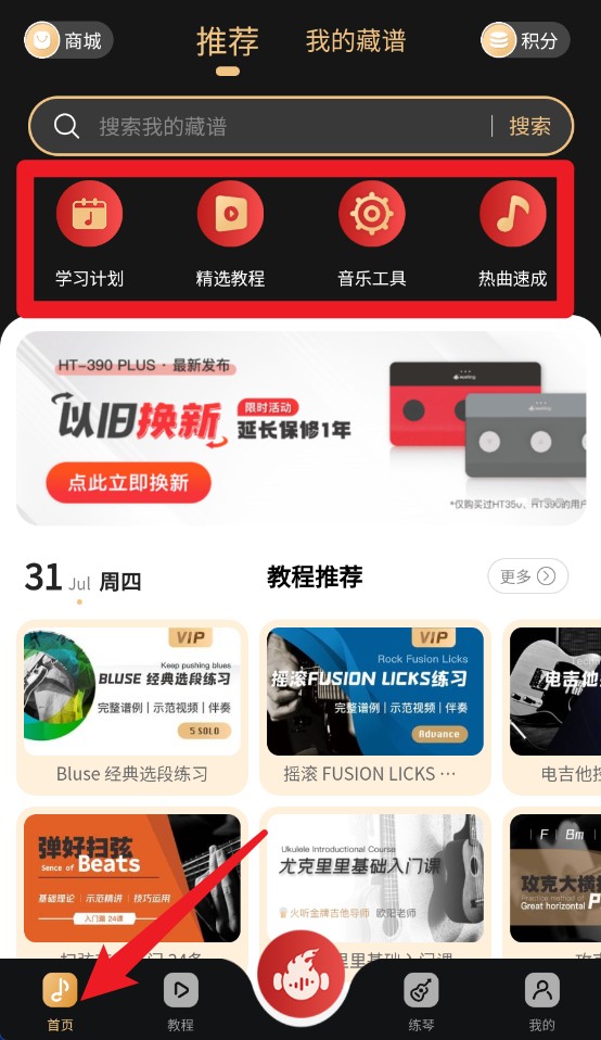 2、主界面集中展示推荐乐谱、精选教学课程与实用音乐工具等核心内容。底部设有首页导航键,可随时一键返回此中心页面。