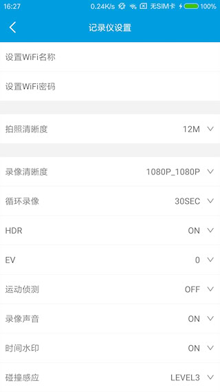 3、 集成了完整的设备参数设置菜单。所有录制分辨率、循环录像时长、音量开关等选项均可在手机端调整,告别了在记录仪小屏幕上进行复杂按键操作的传统方式,设定过程直观简便。