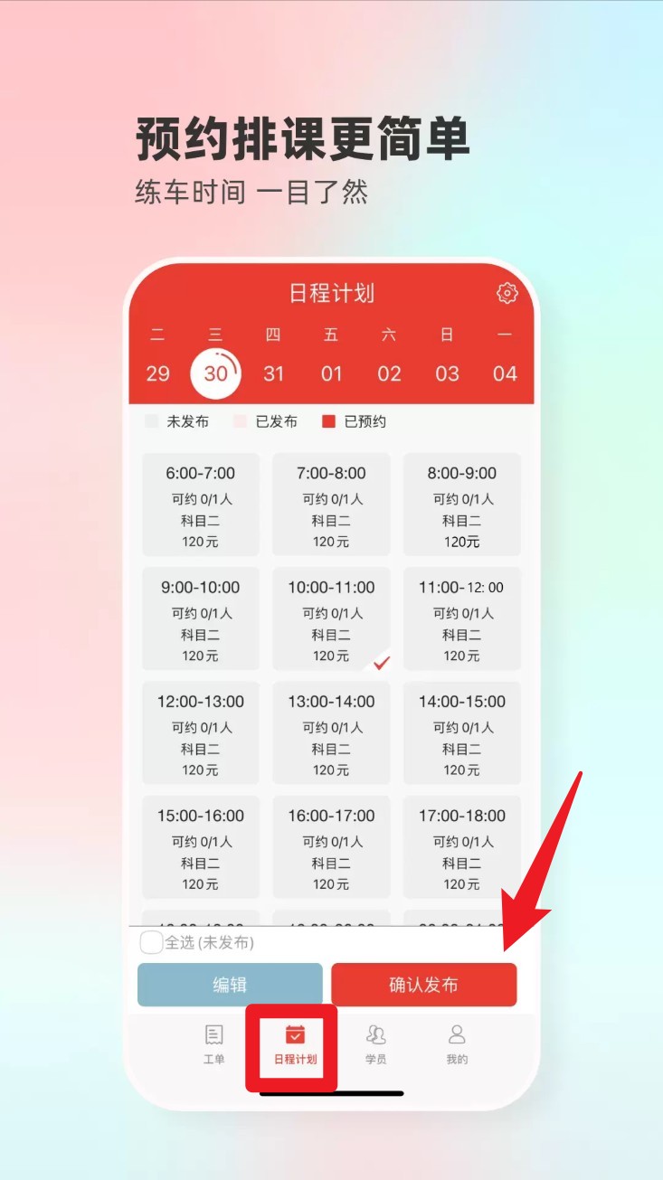 2.登录成功后,点击底部日程计划,在排课界面选择合适的时间段,确认发布,即可完成练车课程的预约安排。